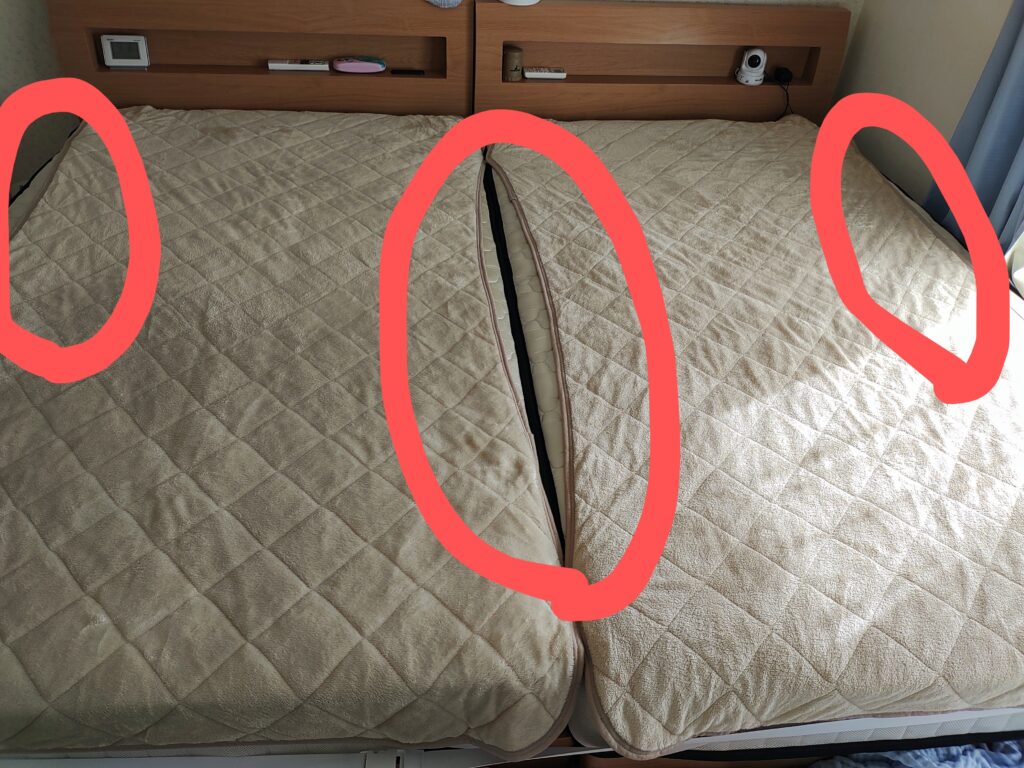 ベッドとベッドの間に隙間ができてしまったり、敷パットが片寄ってしまったりして、ベッドの端のほうに、マットレスがむき出しになる部分ができてしまうのです…。↓